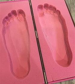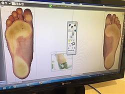 Der erste Schritt ist, dass ein Abdruck meiner Füße gemacht wird in einem Schaumstoff Muster, was an Steckmasse für Blumen erinnert. Es sieht etwas komisch aus, ist aber im Endeffekt nichts anderes als ein Zahnabdruck beim Zahnarzt. Danach werden meine Füße mit dem Scanner vermessen. Auf dem Computer Ausdruck lässt sich wunderbar sehen, wieviel Druck auf welcher Stelle der Fußsohle lastet. Durch die Sichtprüfung und auch durch die Computerauswertung kann der Orthopädie Fachhändler genau sehen, wo das Problem ist und welche Einlagen benötigt werden. Im nächsten Schritt darf ich mir aussuchen, welches Obermaterial ich für die Einlagen möchte. Ich wähle Mikrofaser, da es für den Winter nicht so kalt ist am Fuß. Überrascht bin ich über die vielen unterschiedlichen Möglichkeiten, die ich habe! Soll die Einlage eher für den Sport sein, für welche Schuhe, welches Material. So kann wirklich jeder für seine Bedürfnisse etwas aussuchen.