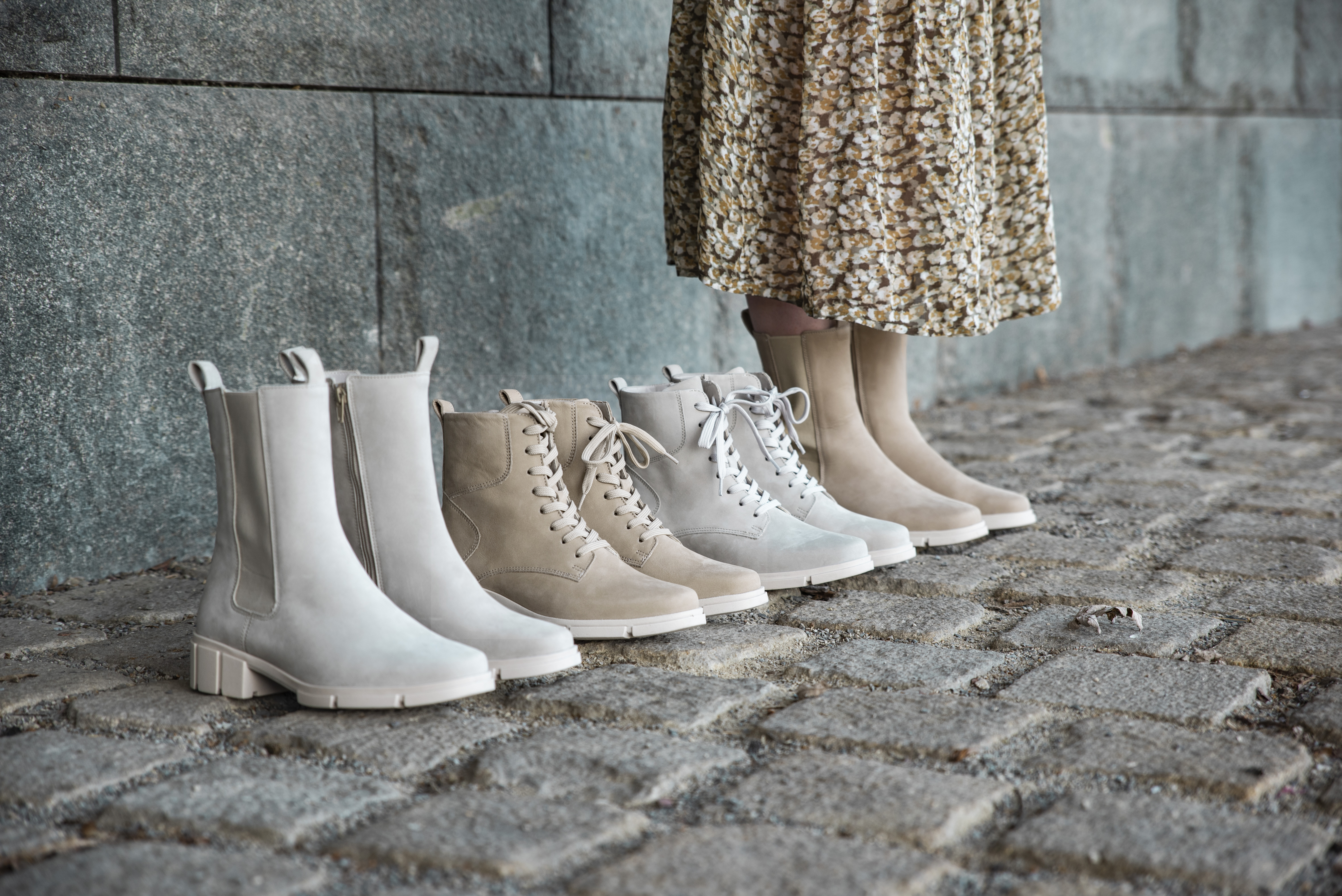 Die neue Stiefelgruppe Kibu überzeugt durch ihre leicht aufgeworfenen, nicht zu extremen Leisten und markante TR-Light-Profilsohlen. Kleine Details verleihen den kernigen Schnürboots das gewisse Etwas: Feminin und edel zugleich wirken Raffungen am Schaftrand. Etwas breitere Senkel machen die Boots noch cooler und dynamischer. Wie harmonisch Komfort und Mode zusammenspielen, beweisen wir mit trendigen Chelseaboots in neuer, wadenhoher Optik.